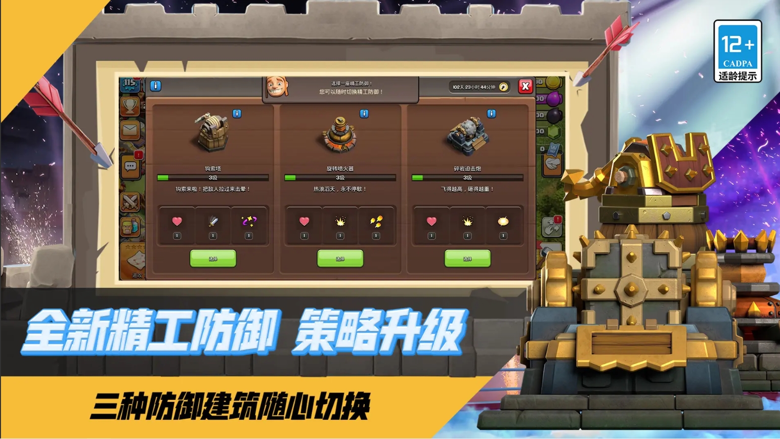 游戏兵种多样,有近战的野蛮人、远程的弓箭手,还有擅长攻坚的巨人、飞行的气球兵等。玩家可依据对手防御布局,灵活搭配兵种,比如用巨人吸引火力,后排跟上弓箭手输出,再配合狂暴法术增强攻击力,展开进攻。同时,还能通过建造部落城堡加入或创建部落,与成员交流互动、互相捐赠兵力,一同参与部落战争,享受团队协作乐趣。