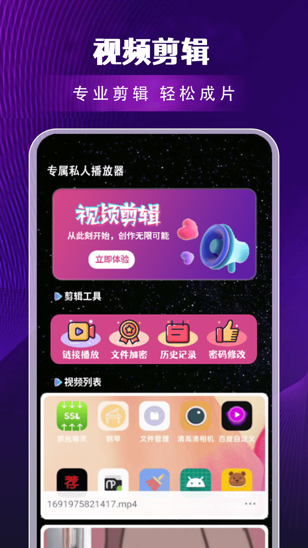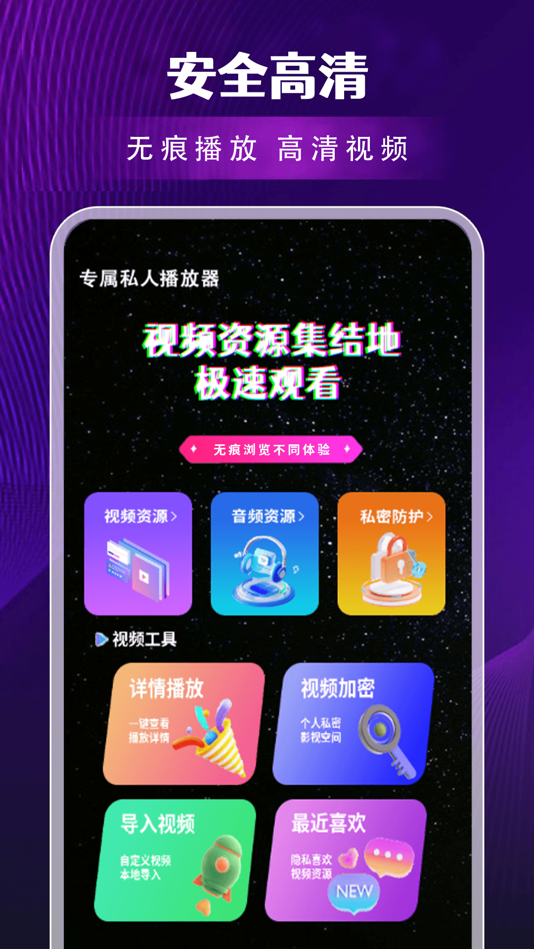 本软件是一款专为用户打造的播放器。支持多种视频格式,完美支持MKV、flv、mp4、mov、wmv、m4v、avi等视频格式。 【本地视频】支持本地视频播放,各种格式无需转码,横竖屏都可以查看,支持高清播放! 【链接视频】支持视频协议http rmtp播放,无需压缩,转码,直接播放! 【私密视频】能够保护私密图片、视频不被人偷窥。