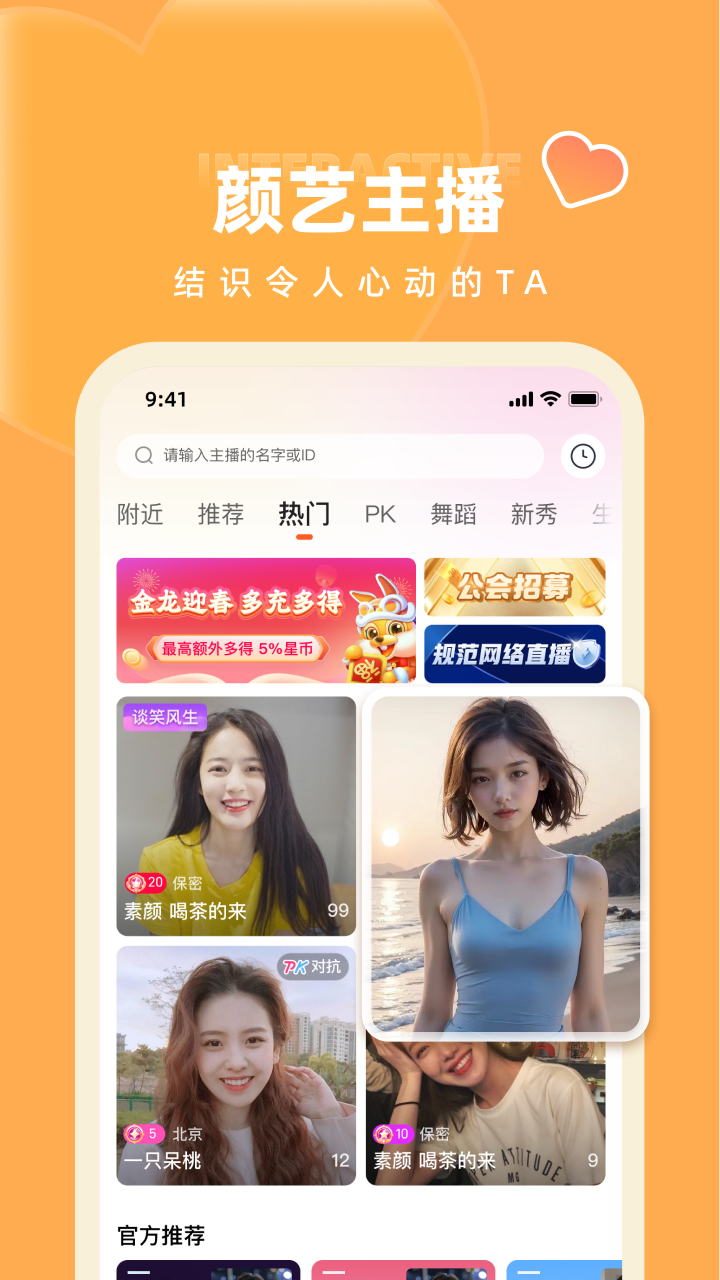 快月直播是国内火爆的视频聊天平台,汇聚多种社交直播玩法,单身的你,快来快月直播遇见身边的TA! 超多同城甜美MM的手机秀场软件,MM帅哥互动交友直播平台。附近高颜值MM热舞唱歌直播中,勇敢表达,不止心动! 新鲜的互动游戏陪你一起嗨不停!最新最潮的直播玩法,送你一场不期而遇,随时随地聊天,遇见让你心动的TA! 功能介绍 【一键登录】QQ、微信、手机账号一键登录 【海量主播】超多高颜值的小姐姐小哥哥实时互动 【多样聊天】通过文字、语音、视频,实时的互动聊天,多样的方式打破僵局,跟默默关注的TA互动 【视频直播】热舞直播、MM直播、才艺直播、活动直播、7*24小时精彩不停