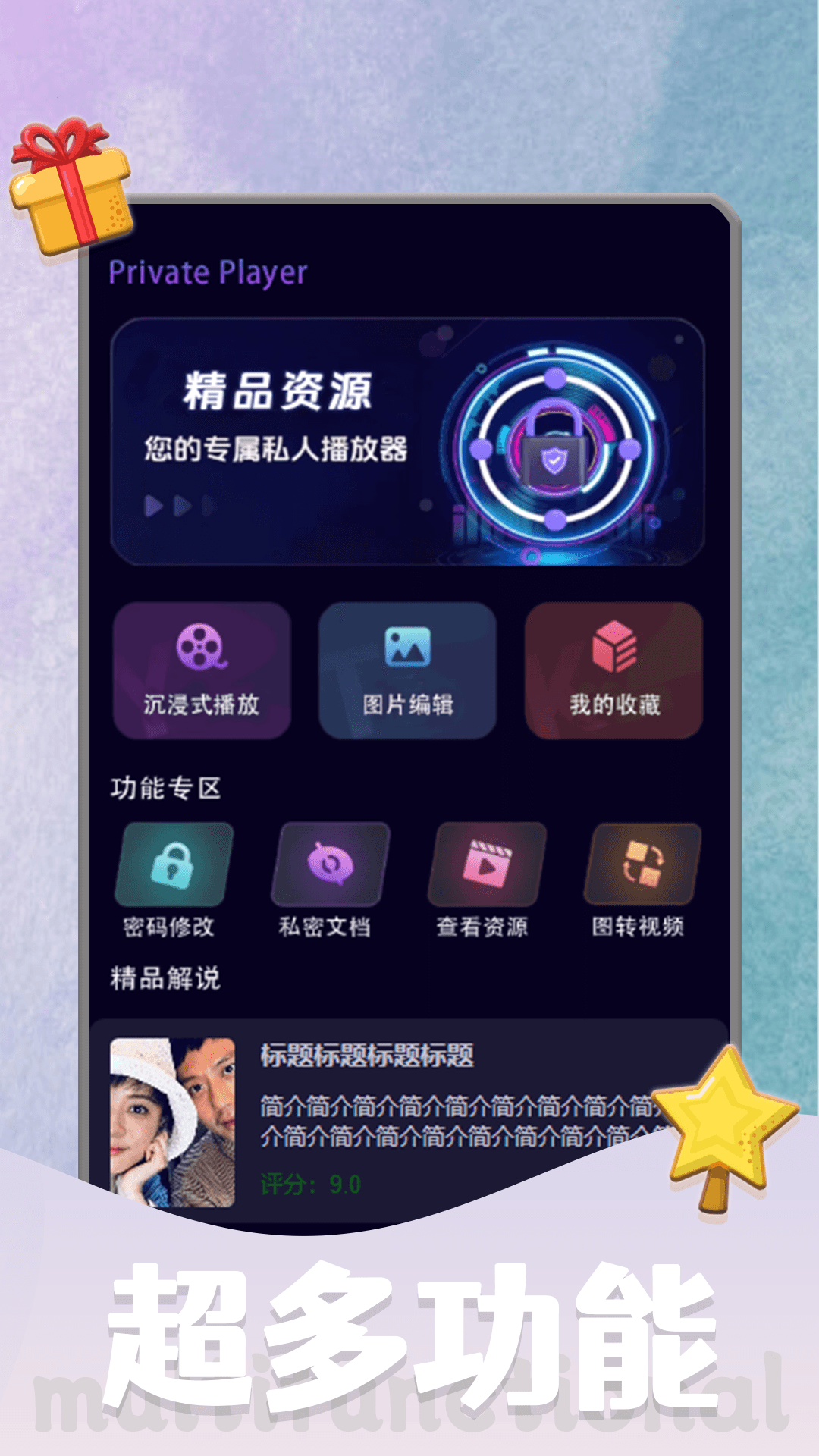 本软件是一款本地视频播放器软件。我们专注于为您提供安全视频播放体验。无需担心隐私泄露,所有播放记录严格保密。界面简洁,操作流畅,支持多种格式播放。无论您身在何处,都能轻松享受您的专属视频时光。立即下载,开启您的观影之旅! 多种视频格式支持: 支持mp4、mov、mkv等多种主流视频格式,无需转码即可直接播放,为用户提供了极大的便利性。 照片视频保护: 特别针对用户隐私需求,提供了照片和视频的保护功能。用户可以对重要或敏感的照片和视频进行加密处理,防止未经授权的访问。加密后的内容只能通过本软件解密并观看,有效保障了用户数据的安全。