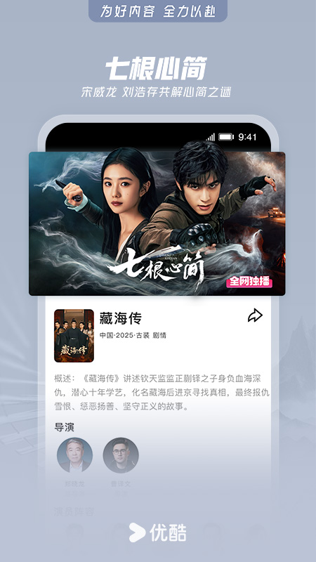 【精品内容,尽在优酷】 《以法之名》年度狠剧!张译扫黑除恶掀司法黑幕 《云深不知梦》大女主复仇爽番来袭! 《水饺皇后》马丽卖水饺上演励志人生 《七根心简》刘浩存宋威龙共解心简之谜 《麻花特开心2》沈腾马丽“穿越”IP世界爆笑团建 《制暴:无限杀机》:硬汉斯坦森孤胆杀穿黑帮 《闪光的夏天2》韩红带队加盟,72小时创作燃唱今夏 《藏海传》全员狠人!灭门案引连环杀局 《向阳·花》刑满释放女囚困境求生 《风驰赛车手》怀揣赛车梦的全明星们褪去星光,驰骋赛道热血开跑。这个夏天让我们一起燃“擎”! 《执法者们》黄宗泽x马国明x陈豪并肩除恶 《这是我的西游》时代少年团开启爆笑之旅 《唐探1900》王宝强刘昊然跨时空破案 《师兄啊师兄》反套路修仙稳到飞起 《蛮好的人生》反内耗!孙俪人生“斗”士不打窝囊局 《奔跑吧 第九季》周深、孟子义、李昀锐活力奔跑,优酷独家加更内容陪你快乐一整夏! 肖战版《射雕英雄传:侠之大者》热播,徐克震撼再现金庸武侠 《吃饭跑步和恋爱》陈飞宇庄达菲校园初恋破镜重圆 《无限超越班》第三季重磅回归,好戏开场 《误杀3》误杀系列高能回归,肖央再陷迷局 《我是隐藏款》潮玩综艺来袭,每周日开出惊喜 《以美之名》姚晨贾静雯联手逆风翻盘 《念无双》唐嫣刘学义一眼万年宿命之恋 《老狗》刘奕铁姜武患难交锋包贝尔 《嘘,国王在冬眠》虞书欣林一高甜冰雪情缘 《窗前明月,咣!》费翔马东锡宋小宝奇咖喜聚 《难哄》白敬亭章若楠演绎纯爱童话 国内外大剧热综、扎堆院线影片、二次元热血动漫……看视频,用优酷APP 【简介】 兼容Phone和Pad设备。优酷中国知名视频网站,优酷App为7亿用户提供电视剧,电影,动漫,音乐,新闻,娱乐,游戏,原创搞笑等海量影视,高清流畅播放,极速离线缓存,支持微博、微信、朋友圈一键分享。强大搜索功能,优酷在手,应有尽有! 【温馨提示】 期许与鞭策,只为更好的起航!当您使用中如有任何疑问或想吐吐槽,都热忱欢迎您致电我们:400-810-0580(或通过“APP-设置-问题反馈”专属通道留言),优酷君一如既往在等你! 同时,优酷君也期待您脑洞大开的创意与想法,为我们建言献策,凡经采纳即赠优酷定制精美礼品一份哦!