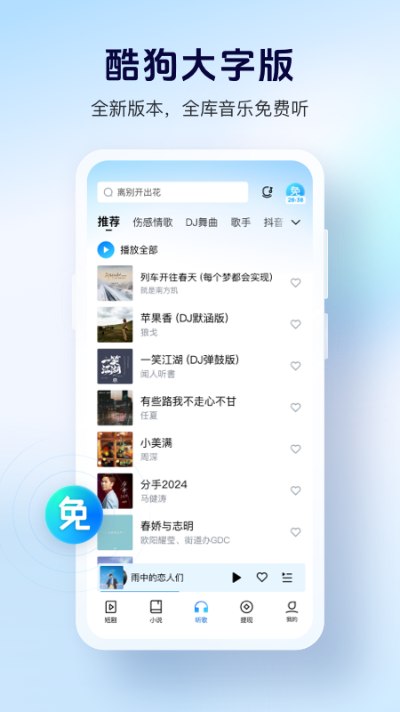 让音乐回归享受,音乐、小说、短剧,全场免费听。还没找到简单好用的音乐软件吗?酷狗大字版,让你听的舒心、看得清楚、唱的开心。一看就会用,不用子女教! 【酷狗旗下】全新版本!海量正版音乐、经典歌曲免费畅听 【APP更轻】性能持续优化,用起来不卡,旧手机也能流畅用 【热门好书】穿越、悬疑、复仇、霸总、虐恋文,应有尽有 【热门短剧】限时体验多种人生,随时刷剧,放松自我
