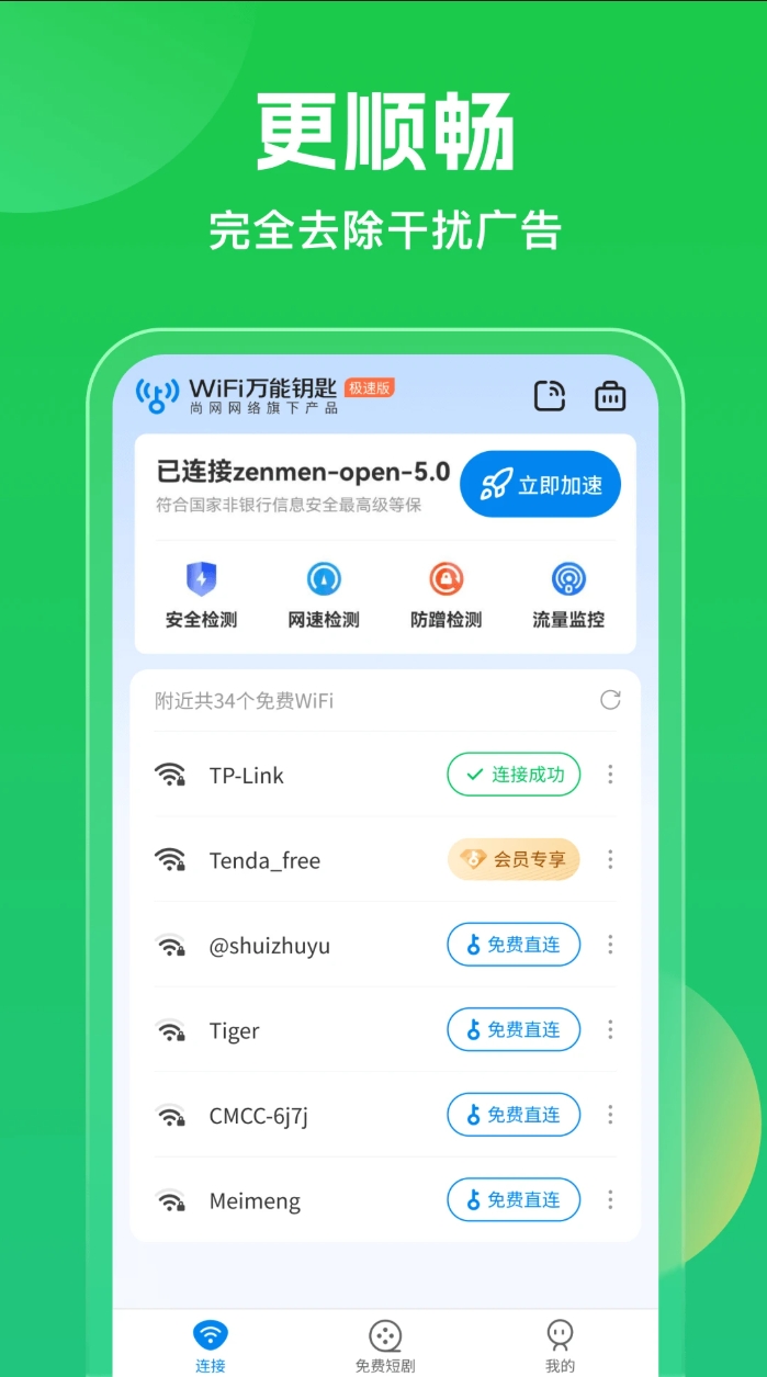 WiFi万能钥匙-通过工信部中国信通院泰尔实验室的移动应用软件安全评估检验,免费连WiFi,省流又安全! 【连接更安全】进一步加强对钓鱼、ARP攻击、DNS篡改等网络攻击行为的实时监测,提供数据加密分级传输、高达90%的恶意攻击拦截等安全防护。 【连接更顺畅】去除干扰广告,保证连接链路无干扰,还用户清爽手机体验! 【连接更省钱】热点推荐更精准,优化信号检测功能,强化网络状态实时提醒,让用户对当前网络状况一目了然。 【Deepseek R1-联网满血版】已接入Deepseek,免费使用深度思考+联网搜索功能,更快的速度、更强大的功能,随时随地为用户答疑解惑! 客服电话:400-035-8000 邮箱:wifikeyservice@ zenmen.com 官网: www.wifi.com