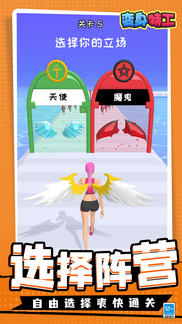 《变身特工》是一款简单休闲的跑酷游戏,身为一名秘密特工玩家可以根据实际情况进行变身,或是天使,或是恶魔,已达到自己的目的,跑到最后的终点。