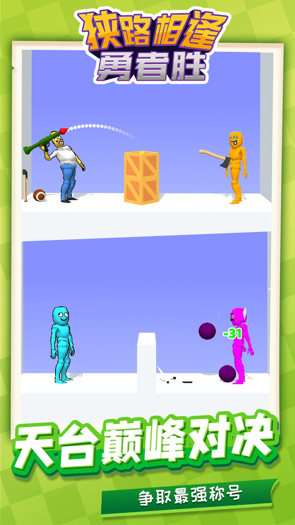 狭路相逢勇者胜是一款休闲类游戏,你需要控制角色来快速的消灭你的对手来获取游戏的胜利,关卡里有着各种道具,合理的运用轻松的战胜对手哦,游戏里超多精心设计的关卡等你挑战哦,越往后关卡的难度越高哦,喜欢的快来下载吧!