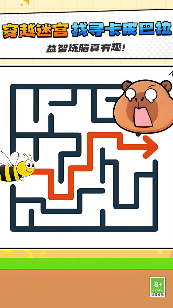 在这款轻松治愈的休闲游戏中,你将化身一只机智的小蜜蜂,身处错综复杂的迷宫之中。通过灵活操控,你需要为蜜蜂规划出一条完美路线,避开障碍与陷阱,最终抵达终点——可爱的卡皮巴拉正在那里等待与你相遇!游戏画风清新,关卡设计巧妙,既能锻炼脑力又能放松心情,适合所有年龄段的玩家体验。