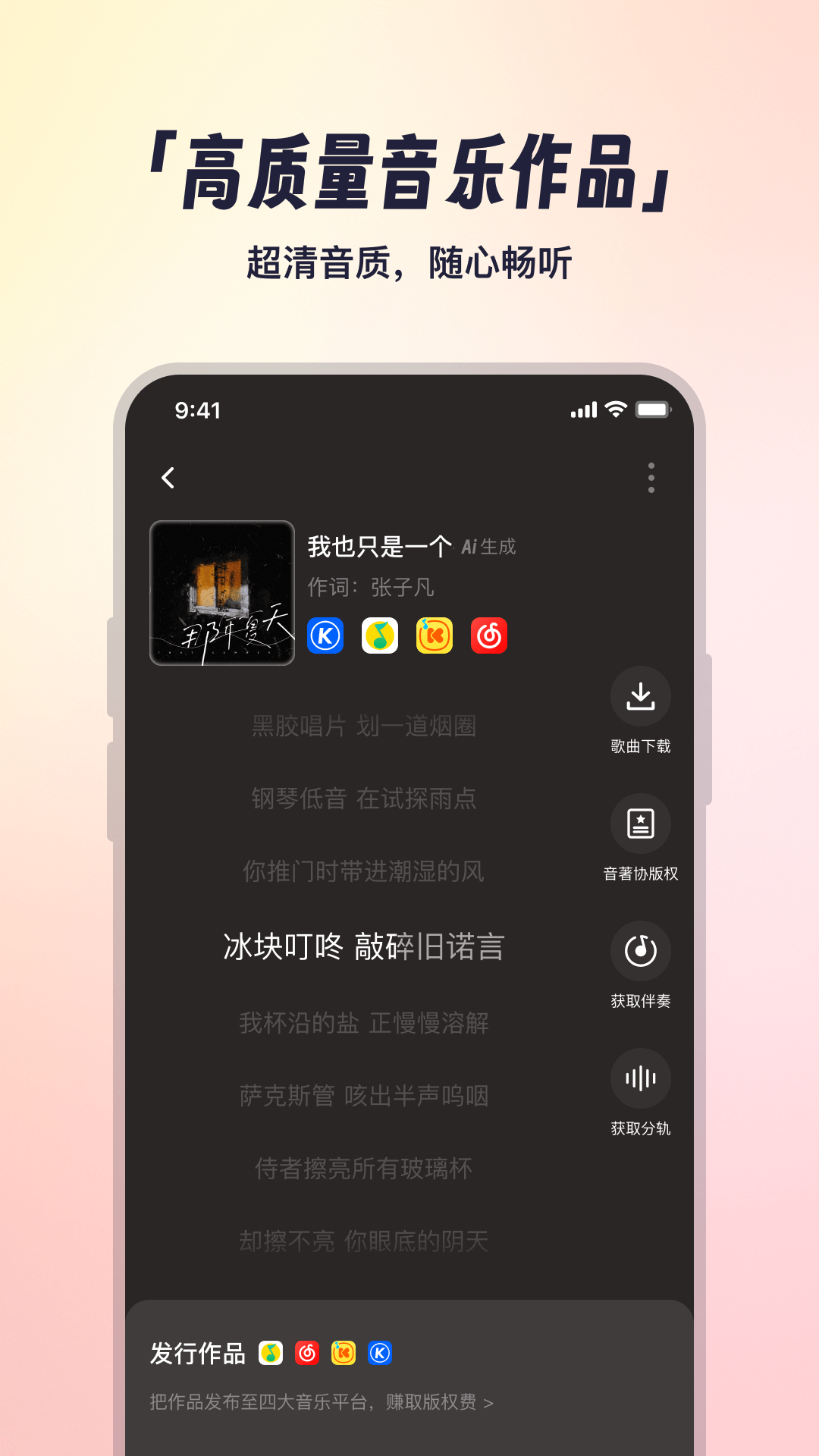 小元音乐圈是一个AI智能写歌+一键发行变现平台。零基础用户可以轻松创作原创音乐,并发行到QQ音乐、网易云等主流平台赚取收益,实现从创作到收益的无缝闭环。 从灵感到发行,从创作到收益——小元音乐圈重新定义音乐创作方式,让每个人都能享受AI科技带来的音乐红利! 功能介绍: 【发行变现】只需三步,让你的歌曲火遍全网躺着赚取收益:(1)创作:AI生成专属原创(几毛钱/首),(2)发行:全平台同步上线(一键操作),(3)变现:坐享平台分成+流量激励。 【AI写歌】包括:灵感写歌(一句灵感生成专属音乐)、歌词写歌(输入歌词自动谱曲)、DeepSeek写歌(深度定制个性化歌曲)、爆款写歌(一键生成热门同款旋律),满足从新手到专业的不同创作需求