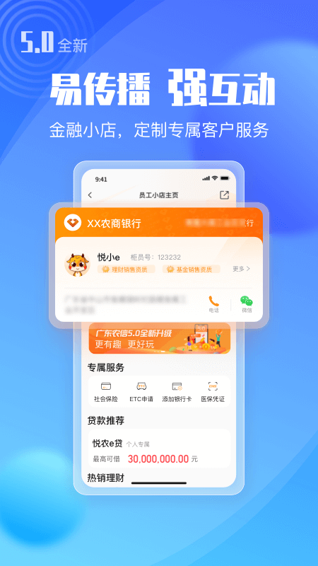 智慧升级,5限精彩,广东农信手机银行5.0全新升级,为您开启提供更个性、更智能、更便捷、更优质、更有温度的体验。 (一)新版面、优体验 全新升级四大页面,版面布局简洁,色彩搭配清爽,重塑视觉体验。个性皮肤随心换,推出春、夏、秋、冬四季皮肤和会员专属皮肤,一键轻松更换专属版面;完善升级关爱版界面交互,字体更大更清晰,优化转账汇款、账户管理等功能界面,业务办理更简单;新增“一键人工客服”按钮,快速解决客户疑问,适老化服务体验更佳。 (二)有智慧、懂所需 推出智能语音功能,7*24小时智能应答,全天候贴心服务,支持普通话、粤语双语模式,语音操作解放双手,功能服务一语直达;上线智能搜索功能,历史记录、热门榜单一点即搜,支持模糊与分类搜索,更懂您的需要,搜索结果按板块分类呈现,搜索结果一目了然;全新推出个性化推荐功能,产品、活动、投资理财千人千面,为客户提供专属服务。 (三)易传播、强互动 全新升级金融零售小店,客户经理化身自媒体,在线分享产品组合和最新资讯,多渠道便捷互动,为客户提供专属定制服务。 (四)E网点、便办理 全新推出E网点功能,轻松查找附近网点,网点服务与网点详情一目了然,网点在线取号更方便,网点排队情况实时掌握,业务办理不用等。