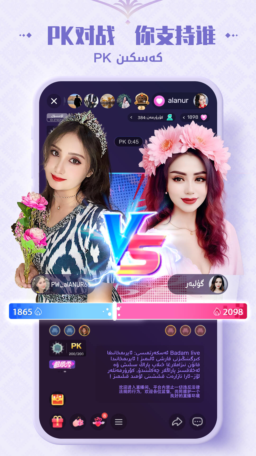 Badam Live(巴旦木直播平台) 新疆明星的才艺展示直播平台; 聚集各类高颜值、有才艺的主播,还有明星、网红直播,节目晚会等各种精彩内容,好看又好玩; pk、连麦、聚会、分享生活等各种互动玩法打发无聊时光;成为主播参加活动、完成开播任务还可获得额外奖励; بادام بىۋاستە تارقىتىش (جىبو) سۇپىسى بولسا بادام شىركىتى يېڭىدىن ئىشلەپ چىقارغان شىنجاڭلىقلارنىڭ ئۆزىنىڭ تالانتىنى نامايەن قىلىش سۇپىسى بولۇپ ، بۇ يەردە سىز تالانتىڭىزنى جارى قىلالايسىز، دوستلىشالايسىز، ھەقسىز چولپانلارنىڭ ئويۇنلىرى كۆرەلەيسىز، تالانىتلىقلار بىلەن ، چولپانلار بىلەن دوستلىشىپ بىللە سۈرئەتلىك پاراڭلىشالايسىز، تىزدىن چۈشۈرۈپ سىناپ بىقىڭ Badam Live bolsa uygurqa biwasta tarkitix supisi bolup , koznak kixmix baxlan nur aynak kino oyun katarlik applarga ohximaydu,siz buyarda nahxa usul koralaysiz,qolpankar bilan dostlixalaysiz,bu,badamda qolpan bolalaysiz, tizdin badam live ni quxurup jibo kilixni baxlag .