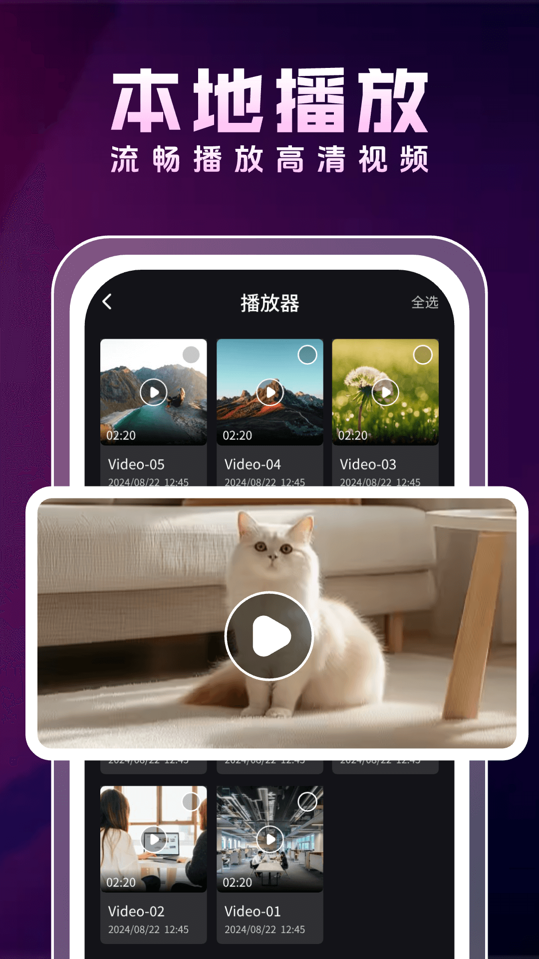 本软件是一款时尚视频播放软件,它是一款视频播放器、全能播放器、本地视频播放器、手机视频播放器、全能视播放器、全能播放器、万能视频播放器、万能播放器、电影播放器、倍速播放器。
