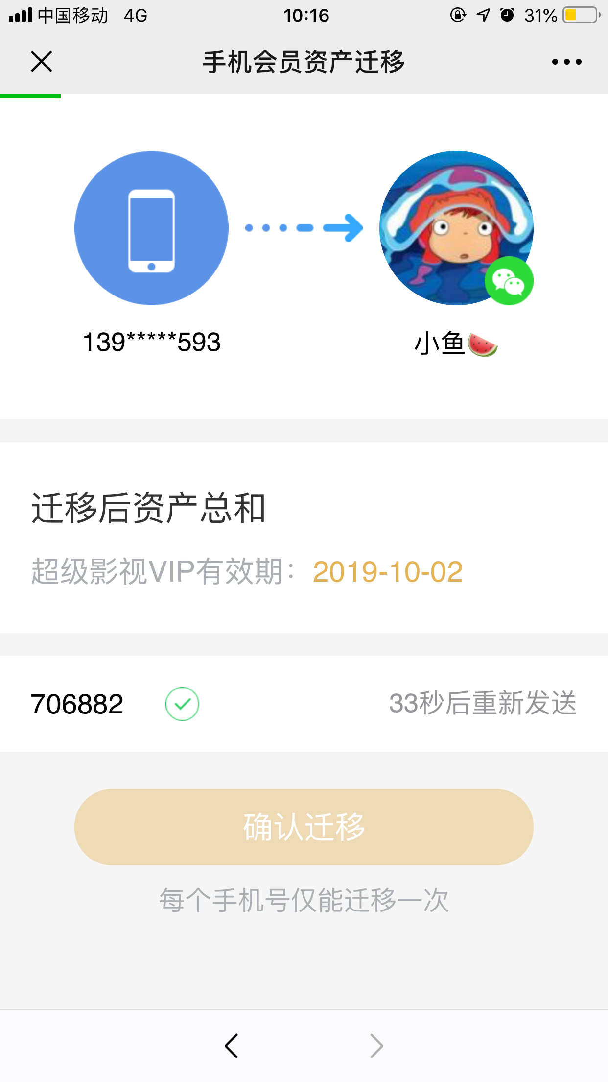 6.根据页面提示,点击获取验证码,将短信验证码输入后,点击确认迁移即可迁移成功。