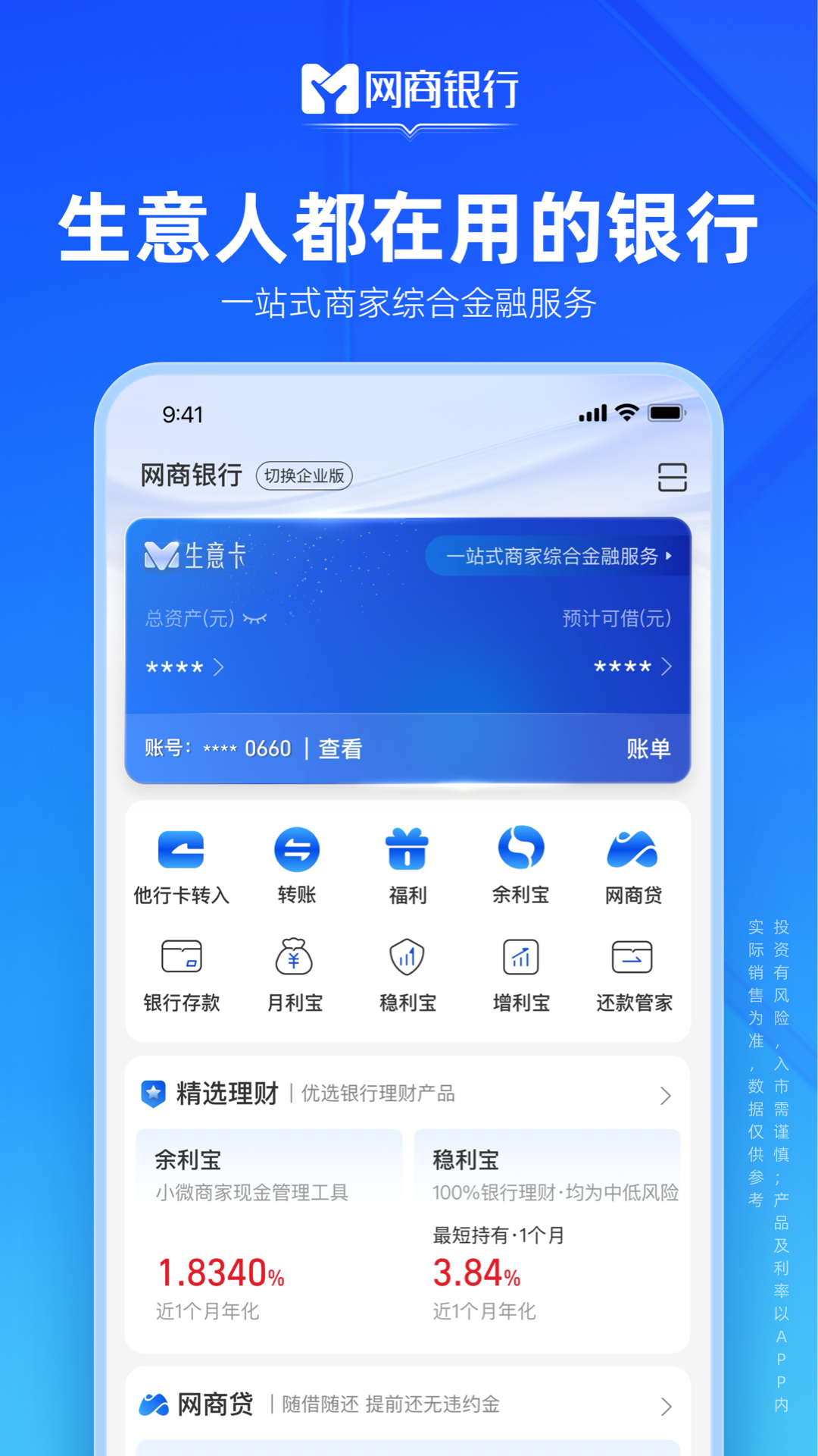 网商银行特色服务: 转账,超方便:提供大额免费转账服务,快速转入转出。 余利宝,专为商家准备的一款灵活的货币基金,千万大额申购。 让贷款,少一点等待:线上申请更简单,放款更快。 关于我们: 浙江网商银行是经中国银保监会批准设立的股份制商业银行,于2015年6月25日正式开业。网商银行以服务小微企业、支持实体经济、践行普惠金融为使命,希望做互联网银行的探索者和普惠金融的实践者,为小微企业、个人创业者提供高效、便捷的金融服务。